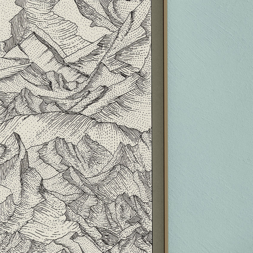 • quadro com desenho detalhado de montanhas em preto e branco com moldura castanha e fundo azul claro